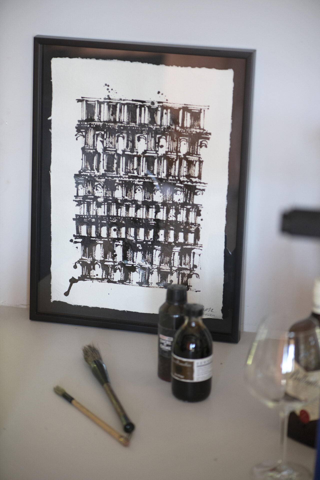 Le choix du papier est un élément clé de mon processus créatif. Je suis particulièrement attaché aux papiers faits à la main qui ont une texture unique et une sensation organique. Ils ont également une histoire, une provenance qui apporte une valeur ajoutée à mes œuvres. Avec le jeu d’encres, j’ai souhaité montrer le dynamisme dans des bâtiments que l’on perçoit comme statiques et rigides.