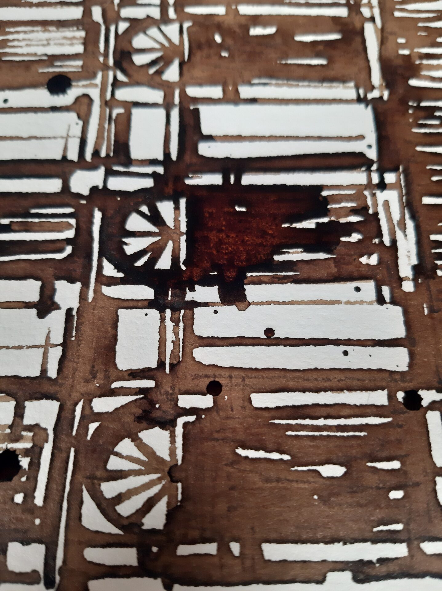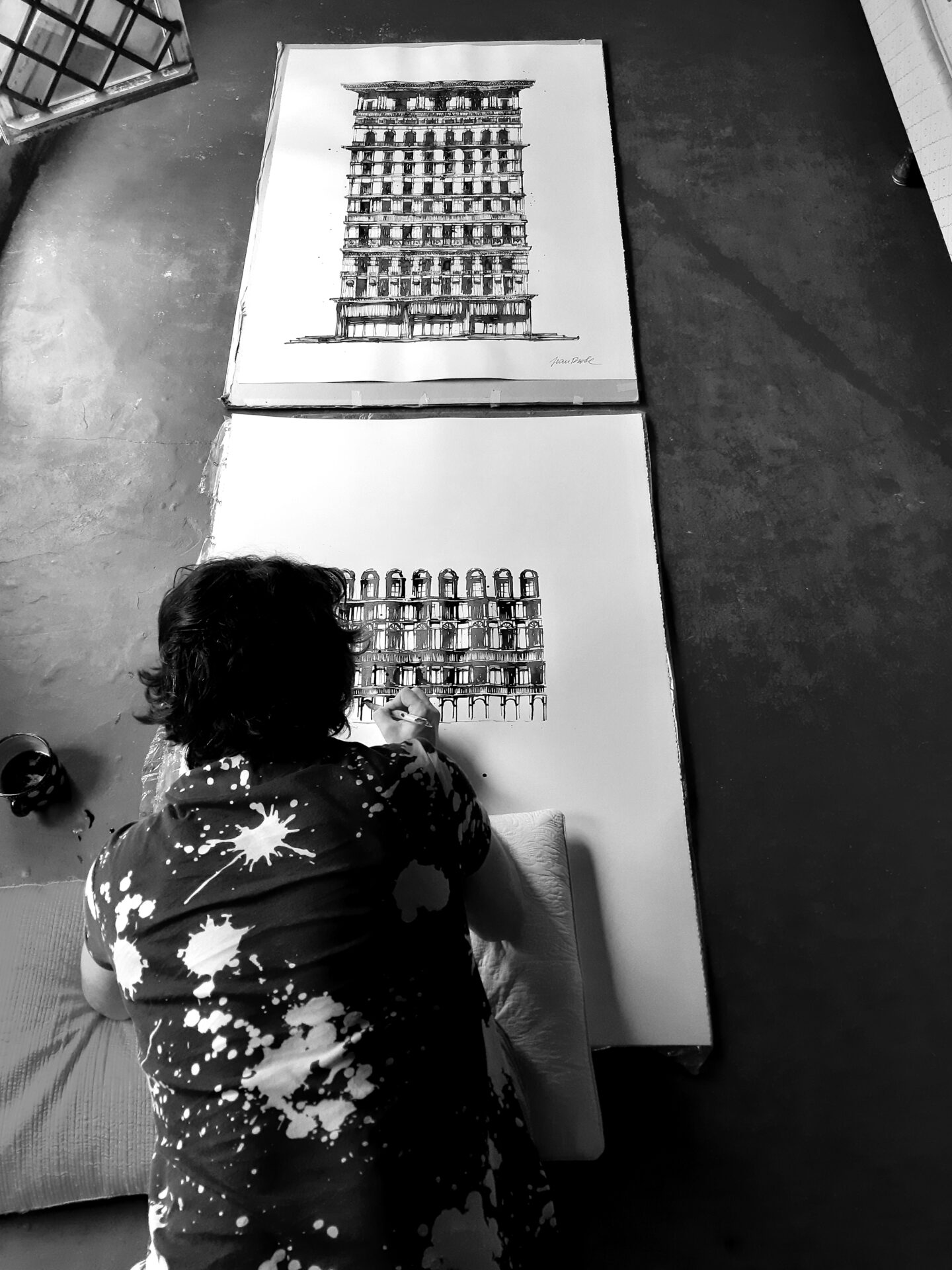 Lorsque j’ai commencé à travailler sur cette série de toiles, je savais que je voulais faire quelque chose de différent. Je voulais capturer l’essence de l’architecture d’une manière qui allait au-delà des simples dessins et plans classiques. J’ai donc décidé de me tourner vers des matériaux inattendus et des méthodes de peinture variées pour ajouter une touche artistique et dynamique à mes œuvres.