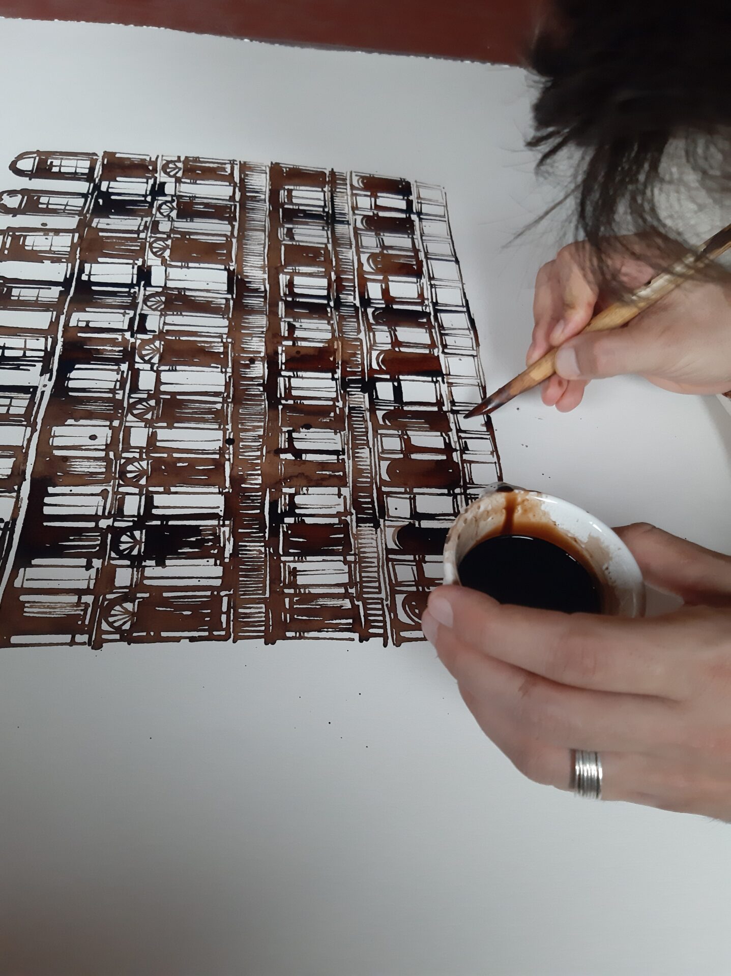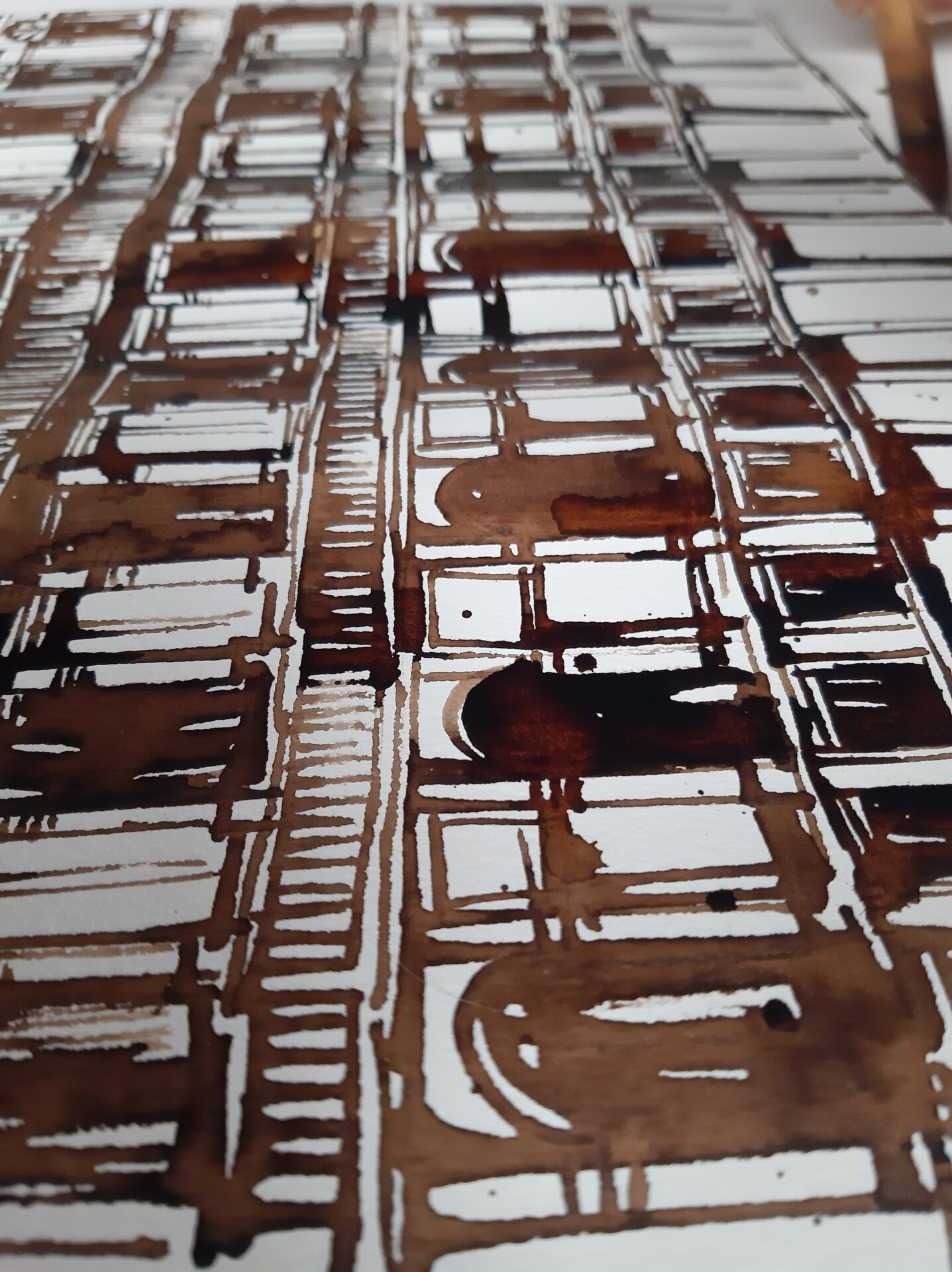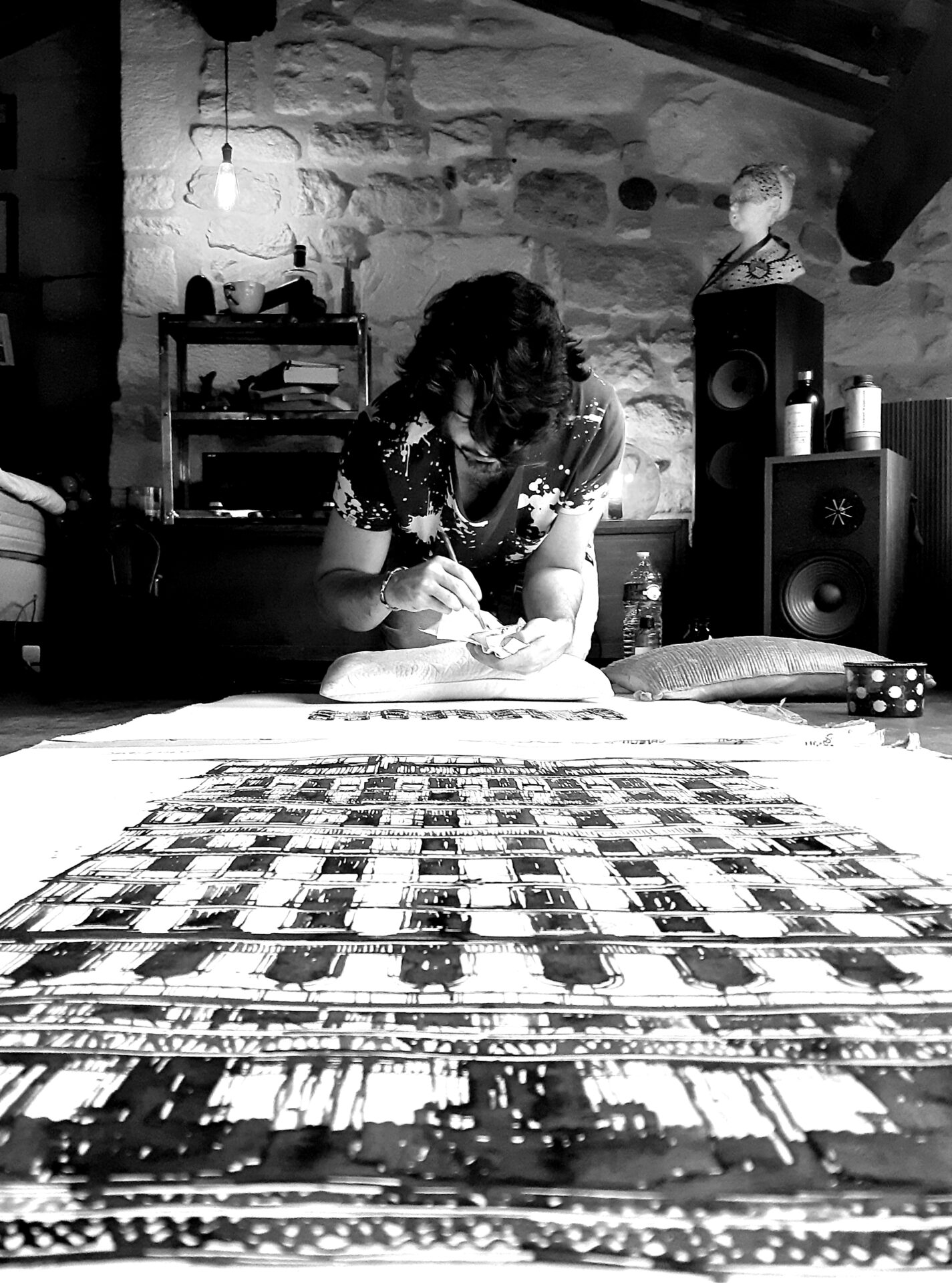 Sur cette série, j’ai principalement travaillé avec des papiers indiens Khadi fait main. J’ai choisi de dessiner au brou de noix et au bambou trempé pour laisser jouer les reflets et les particularités du papier. L’alliance de ces matériaux donne une profondeur et une texture unique. A l’opposé de la précision et de la régularité des plans, ces dessins ont un caractère unique et imprévisible.